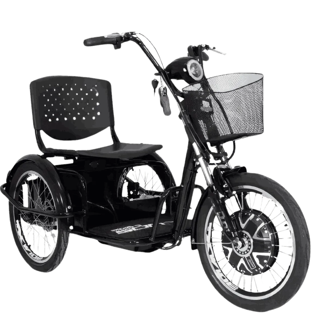 Com rodas aro 20, o triciclo proporciona maior conforto e estabilidade, sendo uma excelente opção de veículo elétrico econômico e sustentável.